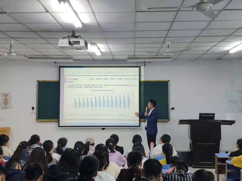 主讲人杨洋从事房地产行业多年,在人才招聘和市场营销方面拥有十分丰富的经验和阅历。杨经理首先分析了当前房地产整体现状和发展趋势,同时结合郑州市的具体情况分析了房地产增长速度下降的原因,并引领同学们对楼市"泡沫"的存在与否进行了讨论,最终为郑州市房地产市场的发展进行新的定位,找到新的增长点。杨经理指出要深刻了解房地产就要了解人口占比、GDP值、城镇规划水平及地理优势等多方面内容,并且要培养自身综合能力与新视野方向。要策划房地产营销就要先了解企业的经营模式及周边地理环境的优劣,要更加精确的去分析当前的形势,去学习一种新的思维方式。最后,杨经理与同学们进行了互动交流,回答了同学们关心的问题。