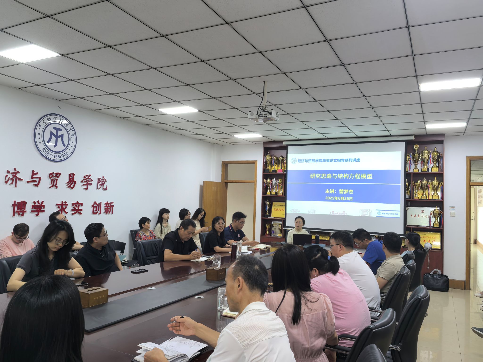 为聚焦研究思路与结构方程模型,助力教师提升复杂问题研究指导能力,6月26日,WilliamHill中文在英才校区教学办公楼327举办了“研究思路与结构方程模型”专题讲座,讲座由我院青年博士曾梦杰老师主讲,我院拟参与本科毕业论文指导的全体教师聆听了讲座,讲座由我院院长李光讲授主持。