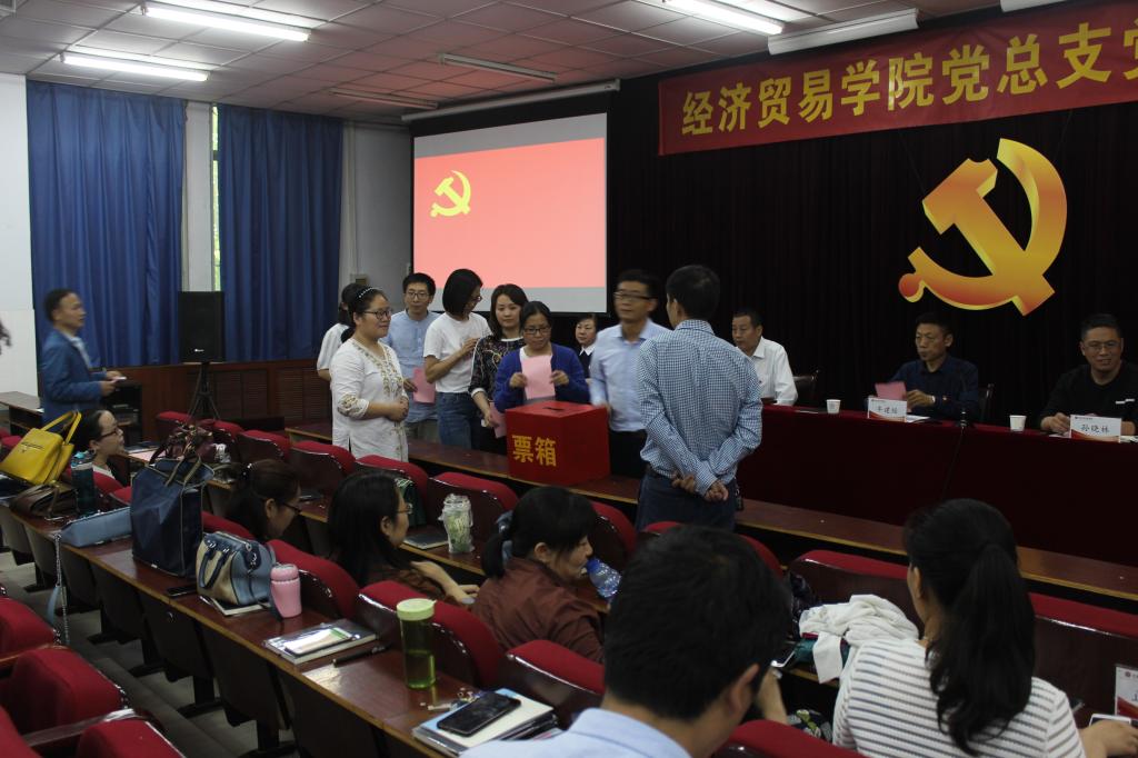 2018年5月3日下午经济贸易学院党支部换届选举会议在英才校区E109隆重举行。经济贸易学院党支部共有党员58人,正式党员33名,预备党员25名。有选举权,被选举权的党员33名。参会正式党员30人,预备党员24人,两位民主人士列席,符合党章规定,大会按程序顺利召开。会议由李光同志主持。